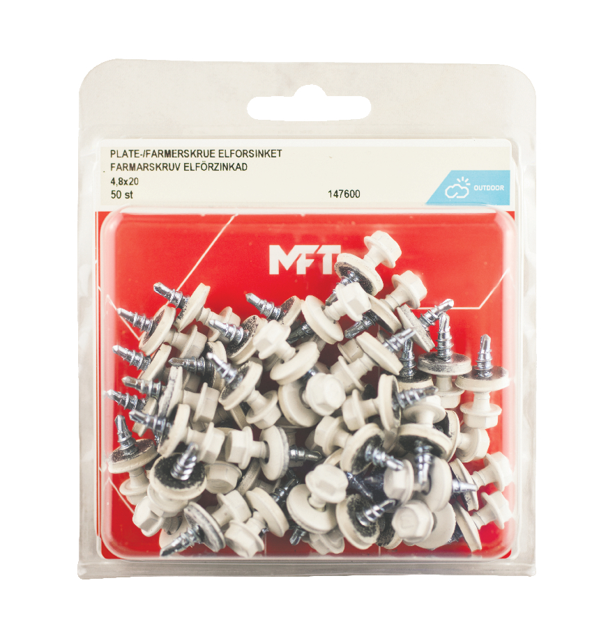 MFT Farmarskruv är avsedd för montage av tak-/fasadplåt max. 2 x 1,0 mm mot underlag av trä. För inomhus och utomhus bruk.