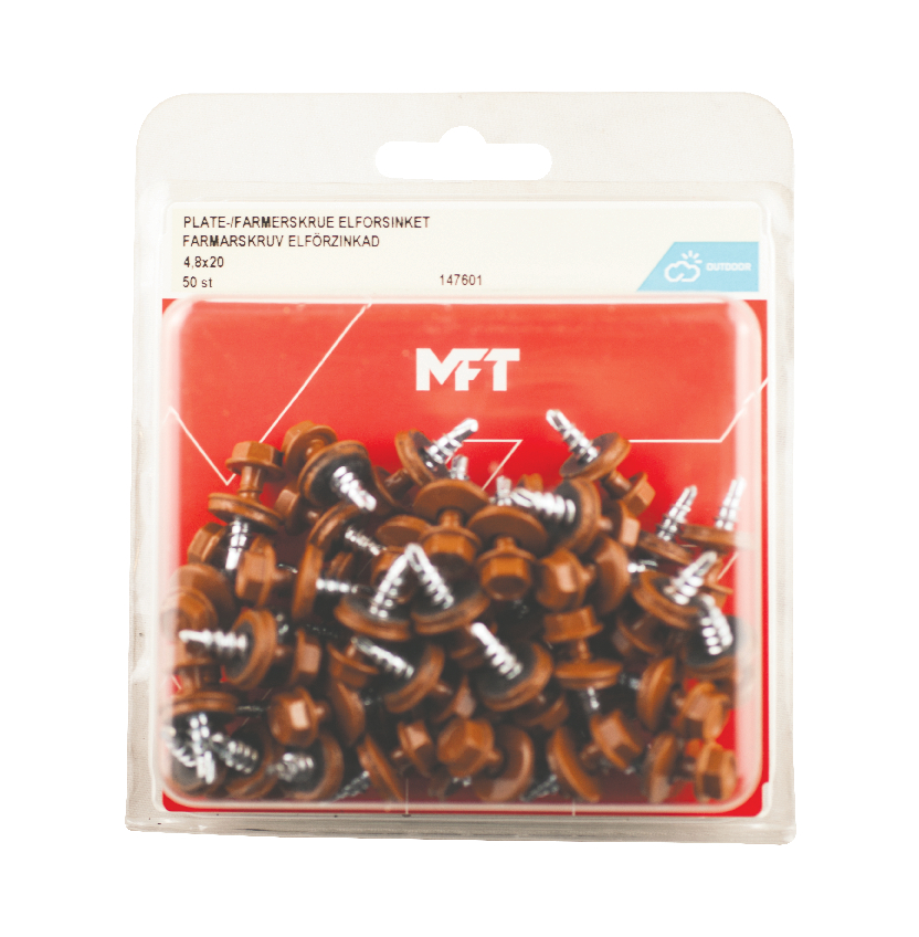 MFT Farmarskruv är avsedd för montage av tak-/fasadplåt max. 2 x 1,0 mm mot underlag av trä. För inomhus och utomhus bruk.