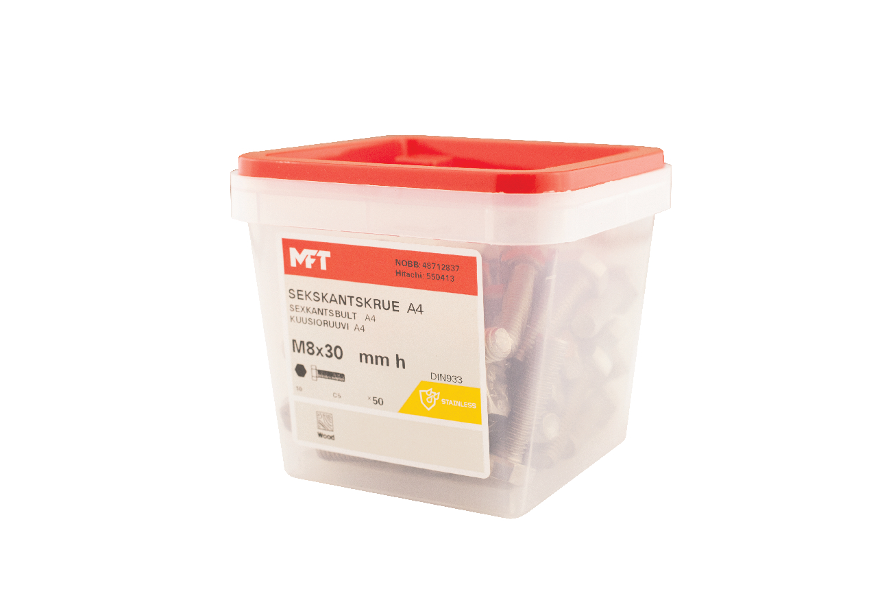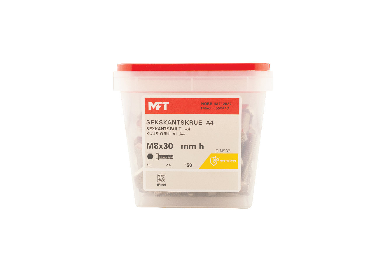 MFT Sexkantskruv M6S är tillverkad enligt DIN933/ISO4017 standard av syrafast stål, kvalitet A4-70. Korrosivitetsklass C5. Helgängad.