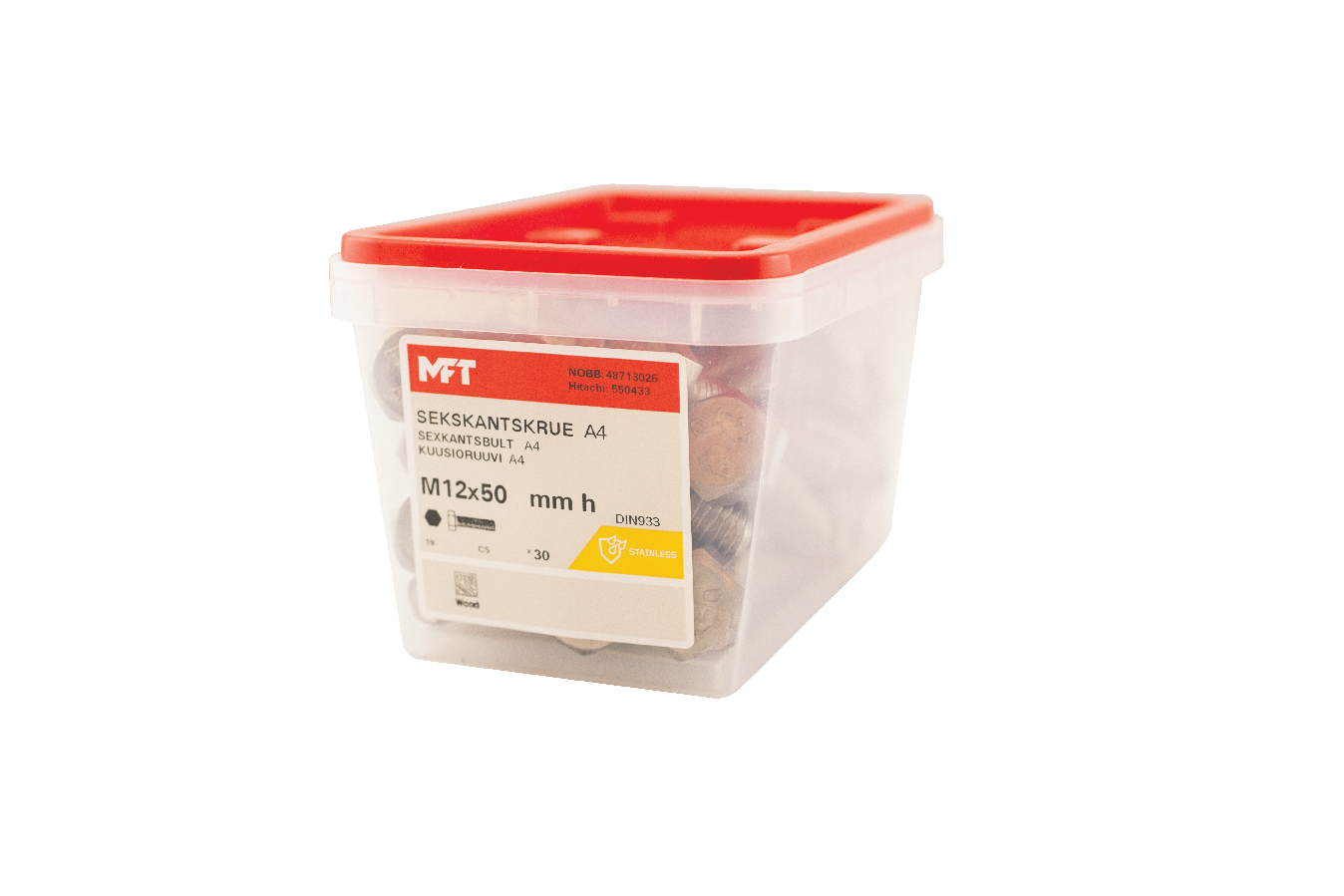 MFT Sexkantskruv M6S är tillverkad enligt DIN933/ISO4017 standard av syrafast stål, kvalitet A4-70. Korrosivitetsklass C5. Helgängad.