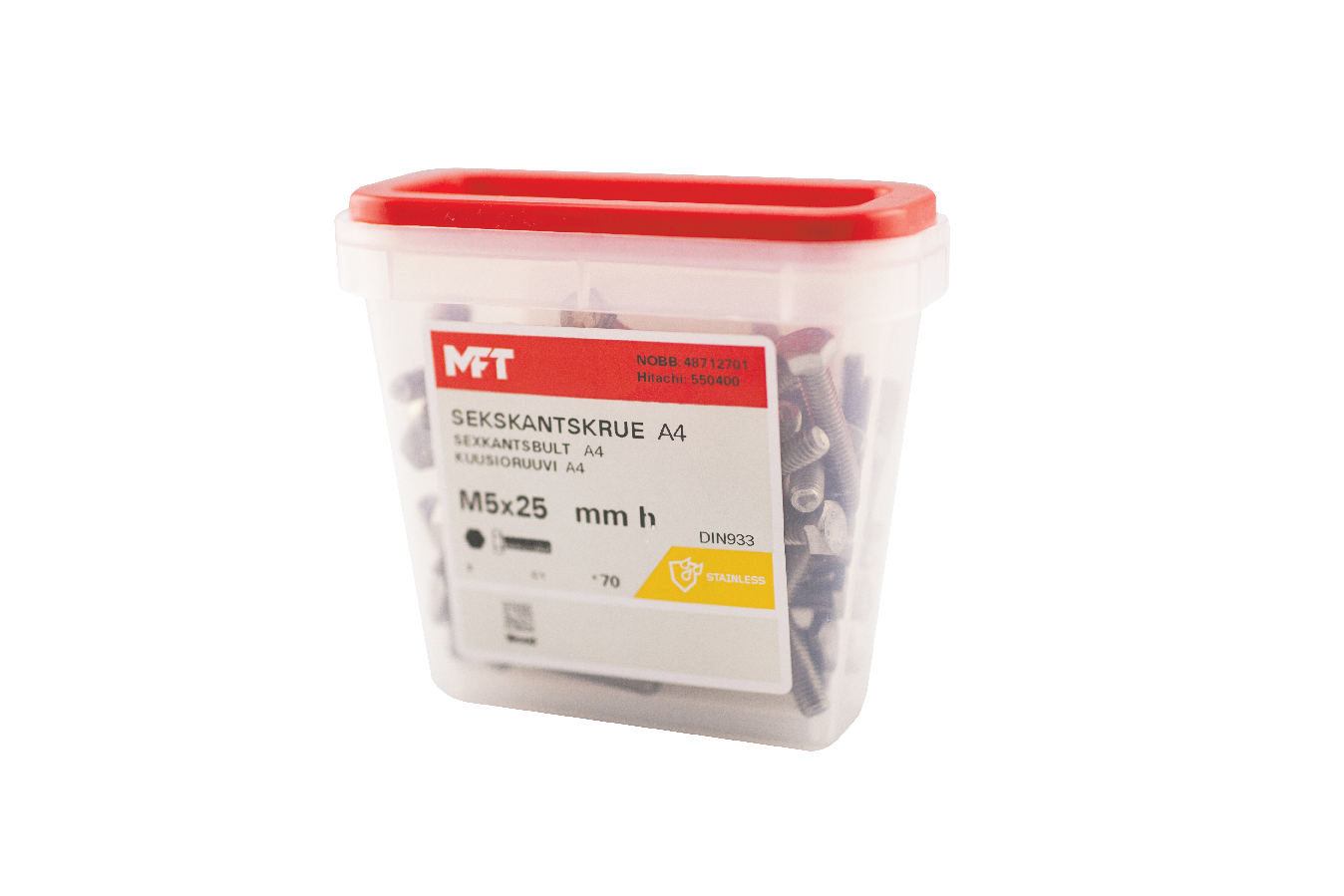 MFT Sexkantskruv M6S är tillverkad enligt DIN933/ISO4017 standard av syrafast stål, kvalitet A4-70. Korrosivitetsklass C5. Helgängad.
