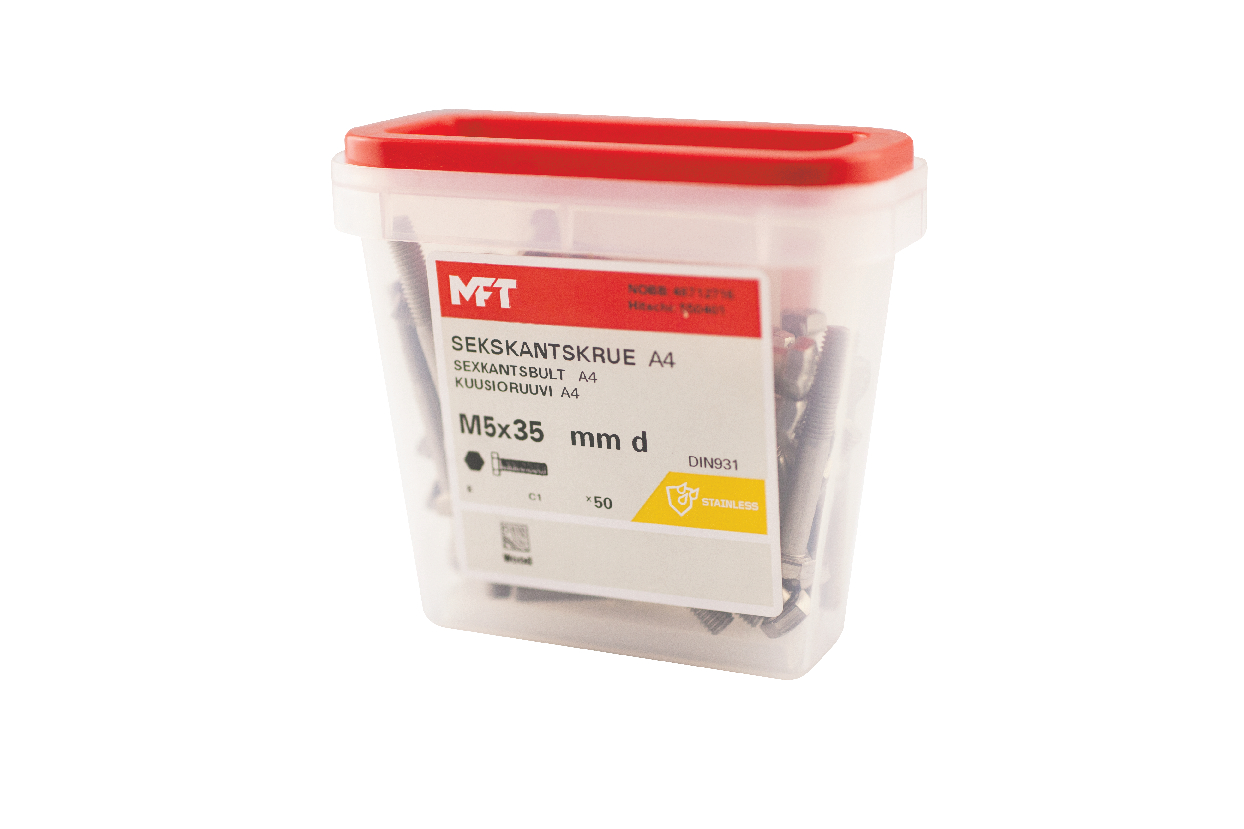 MFT Sexkantskruv M6S är tillverkad enligt DIN931/ISO4014 standard av syrafast stål, kvalitet A4-70. Korrosivitetsklass C5. Delgängad.