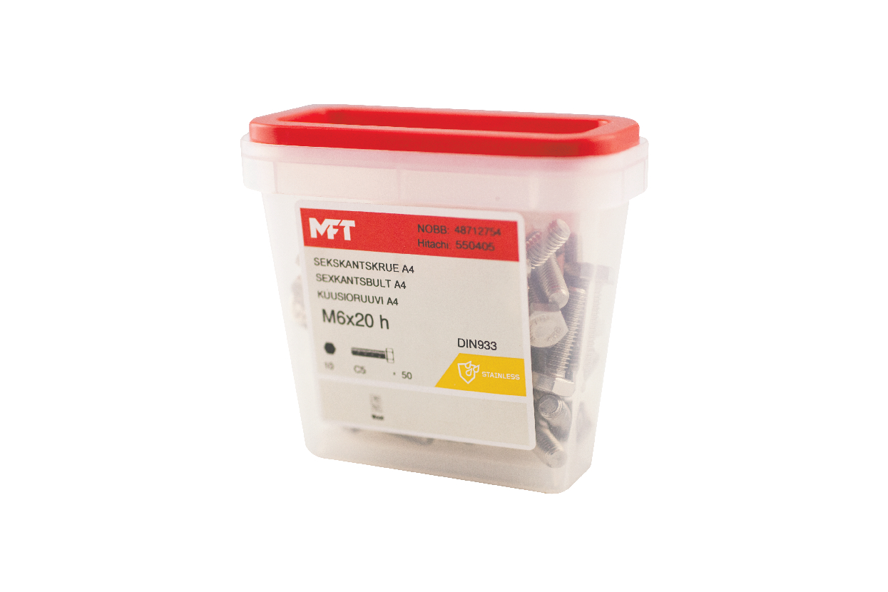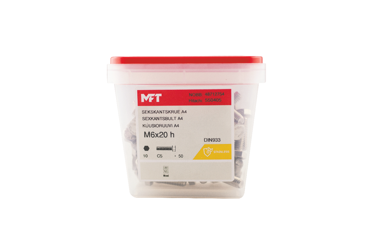 MFT Sexkantskruv M6S är tillverkad enligt DIN933/ISO4017 standard av syrafast stål, kvalitet A4-70. Korrosivitetsklass C5. Helgängad.