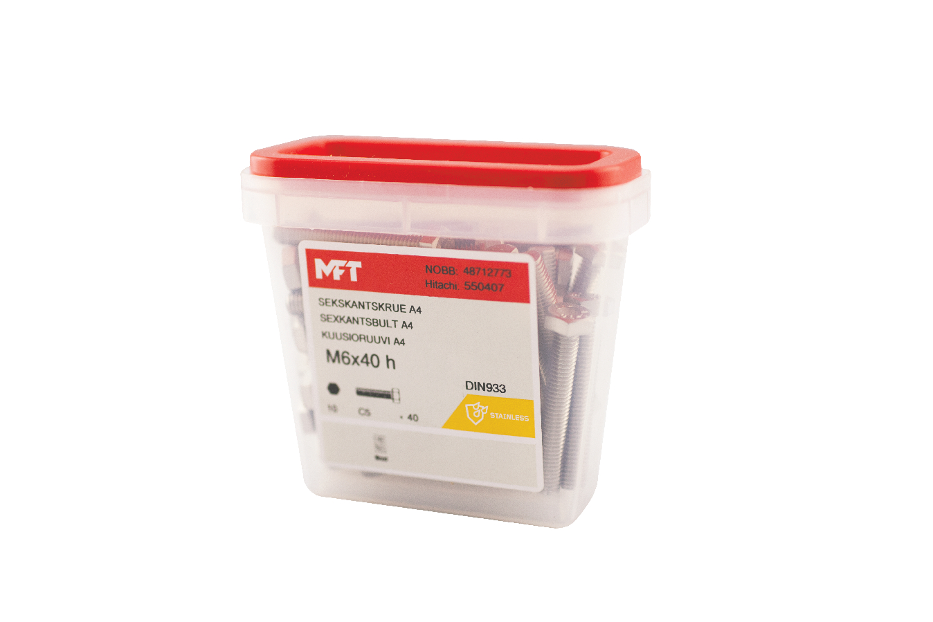 MFT Sexkantskruv M6S är tillverkad enligt DIN933/ISO4017 standard av syrafast stål, kvalitet A4-70. Korrosivitetsklass C5. Helgängad.
