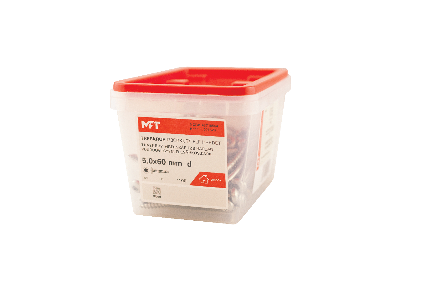 MFT Träskruv kullrig har en blankförzinkad ytbehandling och är tillverkad av härdat kolstål AISI-1022. Korrosivitetsklass C1. Skruven är vaxbehandlad vilket ger ett lägre iskruvningsmoment, skruvspetsen har ett fiberskär som minimerar risk för sprickbildning vid montering. TX bitsfäste för optimalt grepp mellan bits och skruv.