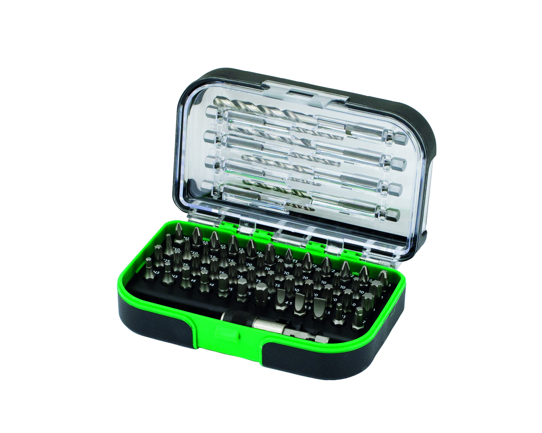 1 st bitshållare med snabbfäste Borr: 2 (x2), 3 (x2), 4 (x2), 5, 6 Phillips: 1, 2 (x4), 3 Pozidrive: 1, 2 (x4), 3 Torx: 10 (x2), 15 (x2), 20 (x7), 25 (x7), 30 (x4), 40 Sexkant: 3 (x2), 4 (x2), 5 (x2), 6 Spår: 4.5, 5.5, 6.5 Fyrkant: 1, 2