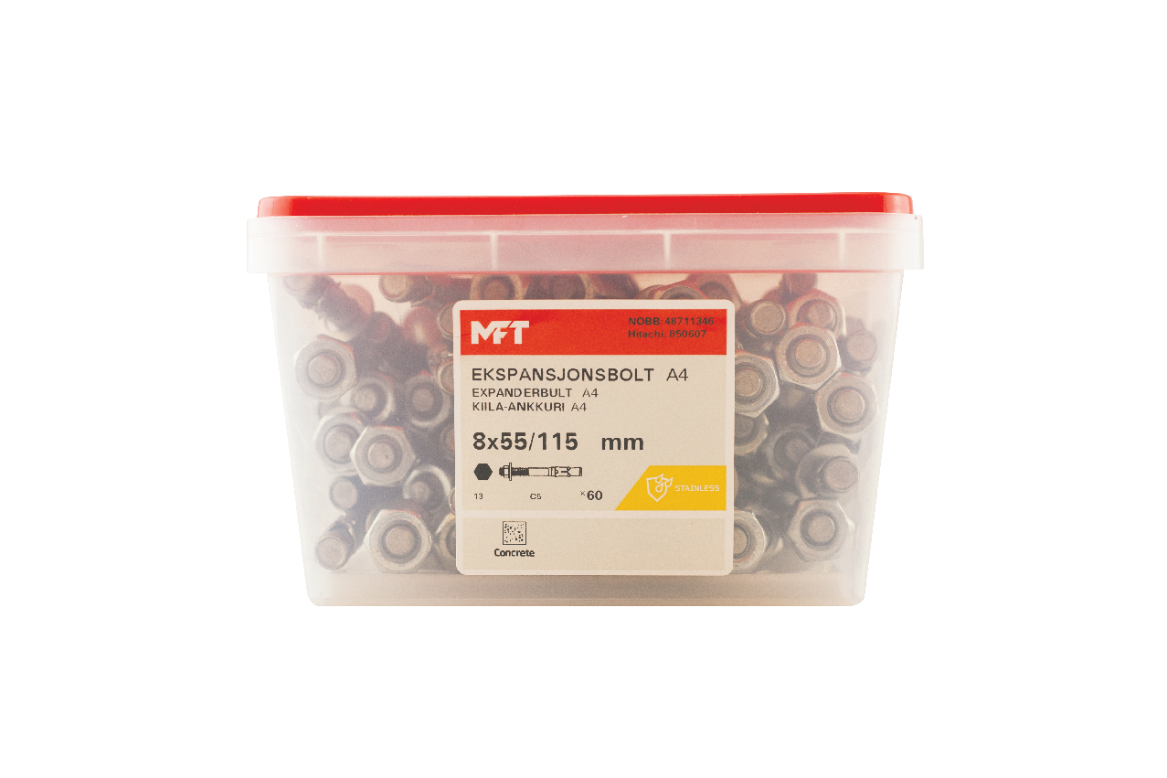MFT Expanderbult tillverkad i rostfritt syrafast stål A4 avsedd för inomhus och utomhus bruk. Avsedd för montage av stål, träreglar, beslag, räckverk mm mot underlag av betong. Borrhålet i betongen skall ha samma diameter som expanderbulten, dvs genomsticksmontage. Expandern slås in med hjälp av en hammare, när muttern kommer i kontakt med detaljunderlaget så låses expandern med muttern. När muttern dras åt så glider klipset upp på den koniska delen, som då skapar en expansion.