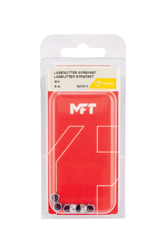 MFT Låsmutter M6M används tillsammans med skruv/bult vid sammanskruvning av detaljer. Den förmonterade nylonringen utgör låsningen av skruvförbandet. Vid upprepade demonteringar så försämras nylonets låsfunktion. För inomhus och utomhus bruk.