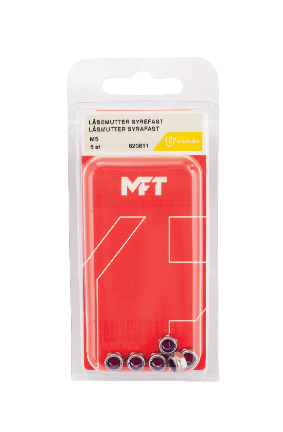 MFT Låsmutter M6M används tillsammans med skruv/bult vid sammanskruvning av detaljer. Den förmonterade nylonringen utgör låsningen av skruvförbandet. Vid upprepade demonteringar så försämras nylonets låsfunktion. För inomhus och utomhus bruk.