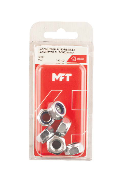 MFT Låsmutter M6M används tillsammans med skruv/bult vid sammanskruvning av detaljer. Den förmonterade nylonringen utgör låsningen av skruvförbandet. Vid upprepade demonteringar så försämras nylonets låsfunktion. För inomhus bruk.