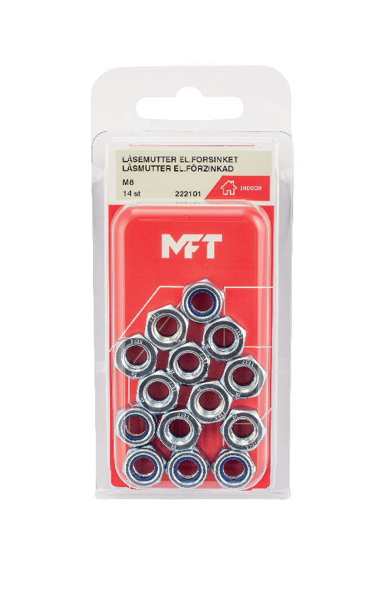 MFT Låsmutter M6M används tillsammans med skruv/bult vid sammanskruvning av detaljer. Den förmonterade nylonringen utgör låsningen av skruvförbandet. Vid upprepade demonteringar så försämras nylonets låsfunktion. För inomhus bruk.