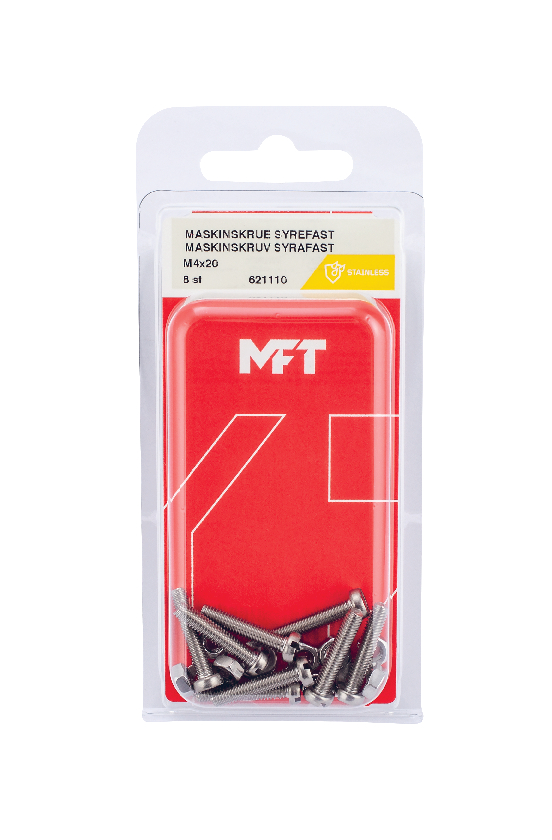 MFT Maskinskruv är tillverkad enligt DIN 84 STD av rostfritt syrafast stål A4 och har cylindriskt huvud. Kvalitet A4-70. Mutter och planbricka ingår. Korrosivitetsklass C5. Skruv och mutter har metrisk gängstigning. Helgängad. Rakt mejselspår.