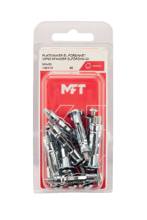 MFT Metallexpander är avsedd för div. tyngre montage i enkel gipsskiva, upp till 20 kg i enkel gips/metallexpander. Greppområde: 5-13 mm. Skall förmonteras, monteras enklast med MFT monteringstång.