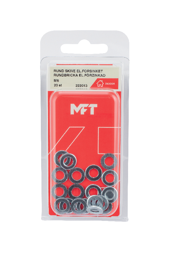 MFT planbricka rund används tillsammans med skruv/bult för att öka tryckfördelningen vid sammanskruvning av detaljer. För inomhus bruk.