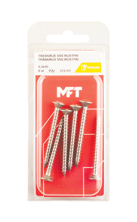 MFT VVS skruv används för montage i fuktiga och aggressiva miljöer som t.ex. badrum, tvättstugor, ouppvärmda utrymmen, garage mm. Fungerar utmärkt tillsammans med nylonplugg när montage sker i hårdare material som natursten, tegel, betong mm. För inomhus och utomhus bruk.