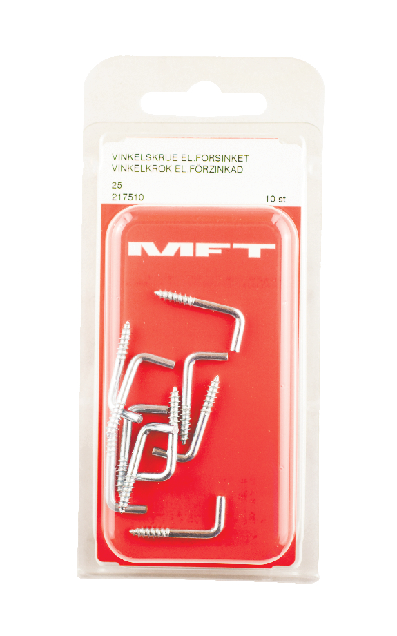 MFT Vinkelkrok är tillverkad av stål med en blankförzinkad ytbehandling. Total längd: 26mm. Tråd diam.: 2,5mm. Gänglängd: 11mm.