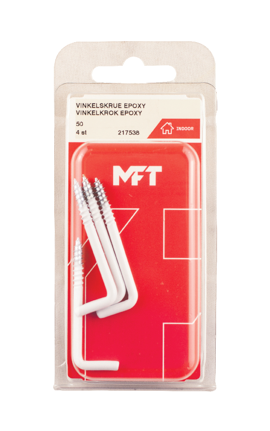 MFT Vinkelkrok är tillverkad av stål med en blankförzinkad ytbehandling och vitlack. Total längd: 52mm. Tråd diam.: 3,3mm. Gänglängd: 20mm.