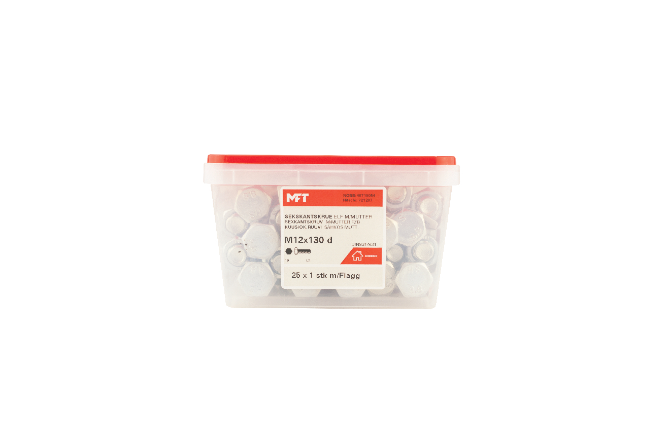 MFT Sexkantskruv M6S är tillverkad enligt DIN931/ISO4014 och muttern enl. DIN 934 standard av härdat kolstål kvalitet 8.8. Skruv och mutter har en blankförzinkad ytbehandling. Korrosivitetsklass C1. Delgängad.