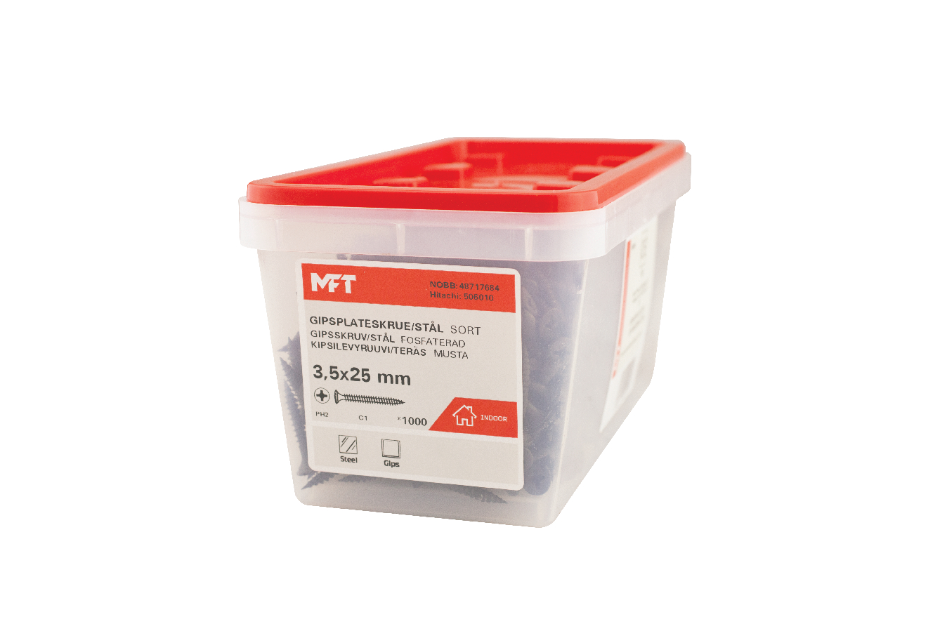 MFT gipsskruv för stålregel är avsedd för montage av normal gipsskiva mot stålregel max. 1,2mm. Rek. antal skruv / m2: 20 - 30 st. För inomhus bruk.