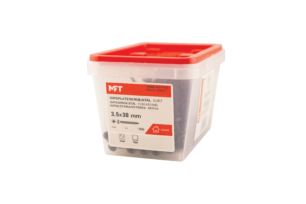 MFT gipsskruv för stålregel är avsedd för montage av normal gipsskiva mot stålregel max. 1,2mm. Rek. antal skruv / m2: 20 - 30 st. För inomhus bruk.