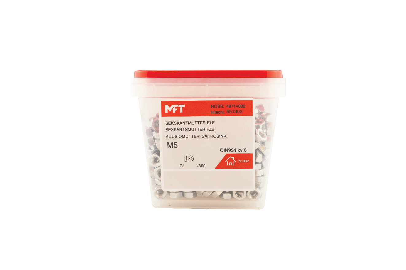MFT Sexkantsmutter M6M i dim. M5 är tillverkad enligt DIN934/ISO4032 standard av härdat kolstål kvalitet 8.8. Muttern har en blankförzinkad ytbehandling. Korrosivitetsklass C1.